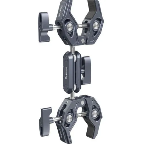 The SmallRig Super Clamp with Double Crab-Shaped Clamps 4103B is crafted from aircraft-grade aluminium alloy and stainless steel, CNC processed, anodised, and carved for enhanced strength and durability. Featuring a skeletal design and shark clamp with increased clamping force, it is compatible with 3/8″-16 threaded holes. The clamp supports rods with a minimum diameter of 14mm and surfaces up to 65mm thick, making it ideal for attaching umbrellas, selfie sticks, microphones, and more to round pipes, tables, handlebars, tripod rods, and handrails. Built-in cushions ensure secure clamping and stability. The integrated ball head magic arm features adjustable ball heads with anti-slip threads and a one-piece connection to prevent disconnection. This clamp is also compatible with the Flexible Vlog Tripod Kit VK-19 (Black) 3904 for versatile shooting setups.