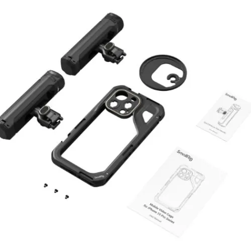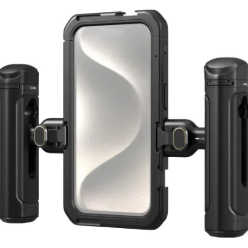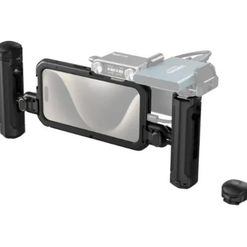 The SmallRig Mobile Video Kit (Dual Handheld) for iPhone 15 Pro 4397B provides enhanced stability for video and vlogging with two handles and wireless control for “one-click” shooting. The cage features multiple 1/4″-20 threaded holes and cold shoes for attaching accessories such as handles, tripods, microphones, and LED video lights. With the new SmallRig Quick Release Ecosystem, you can easily switch between horizontal and vertical shooting orientations. The all-metal full cage supports a variety of lenses, including M-mount lenses, and, with a backplate replacement, 17mm or 37mm threaded lenses or Moment T-series lenses. The cage is designed with precision cutouts for full access to the iPhone’s buttons, ports, radar, ultra-wide-angle lens, and MagSafe wireless charger, while built-in pads protect against shocks and scratches.
