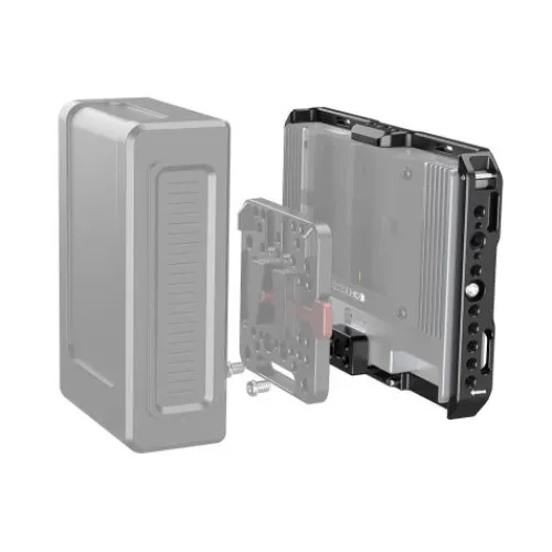 The SmallRig Cage Kit for SmallHD Indie 7 and 702 Touch Monitor CMS2684 offers comprehensive protection and versatility for your monitor. The cage attaches securely with three 1/4″-20 screws-one on the top, one on the bottom, and one on the back. It features multiple 1/4″-20 and ARRI 3/8″-16 threaded holes, allowing you to mount accessories such as Magic Arm 2115, Monitor Mount BSE2348, and Wireless Receiver Bracket 2107. A NATO rail is included at the bottom for quick release with NATO clamp-compatible accessories like Monitor Mount BSE2385. The kit also comes with a sun hood for glare protection in outdoor settings. Additionally, the backplate supports the V-Lock Battery Mount 1846 for attaching a V-mount battery, while rubber pads inside the cage protect the monitor from scratches.