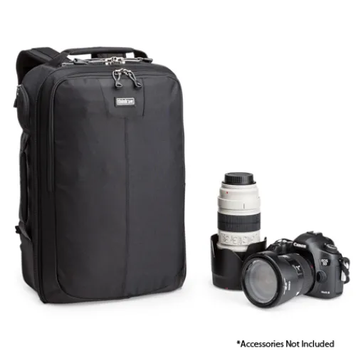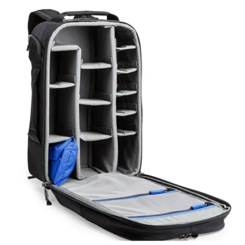 With several removable padded dividers, the main compartment of the Think Tank Airport Essentials back pack can be customised to hold a combination of several assorted items. Removing a few dividers can create a large sub-compartment to hold even a long 500mm lens.
