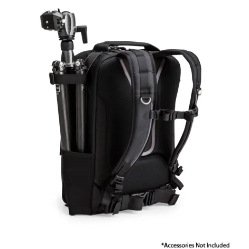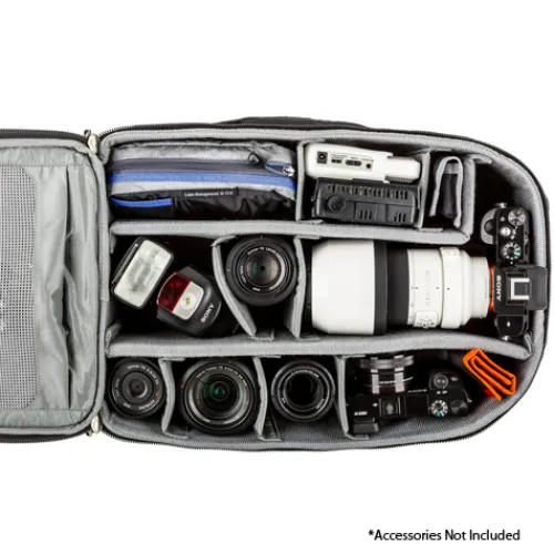 Despite a compact size and slim profile, the backpack can hold most of your shooting essentials. The rectangular design features an efficient padded interior that is capable of carrying a standard DSLR with a 70-200 f/2.8 telephoto lens attached, several additional lenses, speedlights, a laptop, a tablet and a variety of personal and photographic accessories.