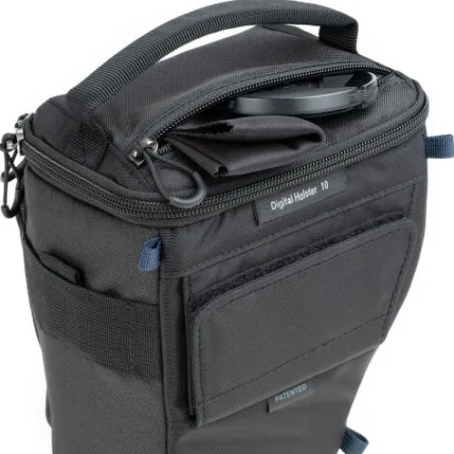 Protect and carry your camera with the V3 Digital Holster 10 from Think Tank Photo, designed to fit a large compact camera with a 28-70mm lens attached and the hood reversed. The “pop down” feature allows you to expand the holster to accommodate a 24-70mm f/2.8 lens with the hood reversed. A removable soft divider helps safeguard your camera’s LCD screen from the strap. Carry it using the top handle, wear it over your shoulder with the removable nonslip strap, or attach it to your belt via the rear loop for convenient access.