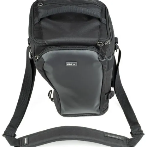 Protect and carry your camera with the V3 Digital Holster 40 from Think Tank Photo, designed to fit a gripped DSLR with a 24-70mm f/2.8 lens and the hood reversed. The “pop down” feature allows the holster to expand, accommodating a 70-200mm f/2.8 lens with its hood reversed. A removable soft divider helps protect your camera’s LCD screen from the strap. Carry it using the top handle, wear it over your shoulder with the removable nonslip strap, or attach it to your belt via the rear loop for convenient access.