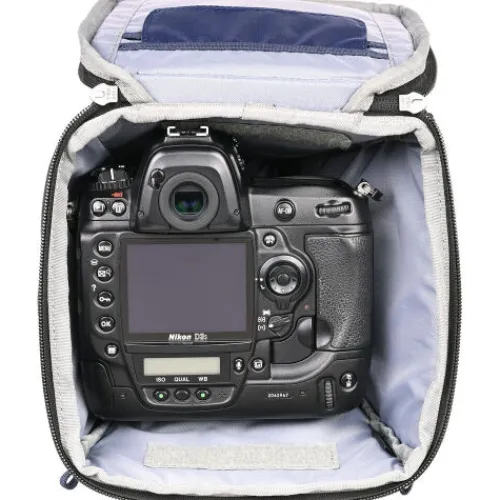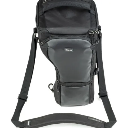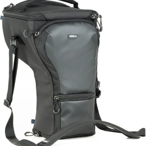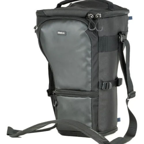 Protect and carry your camera with the V3 Digital Holster 50 from Think Tank Photo, designed to fit a gripped DSLR with a 70-200mm lens and the hood reversed. The “pop down” feature allows the holster to expand, accommodating a 70-200mm f/2.8 lens with the hood in the shooting position. A removable soft divider helps protect your camera’s LCD screen from the strap. Carry it using the top handle, wear it over your shoulder with the removable nonslip strap, or attach it to your belt via the rear loop for convenient access.