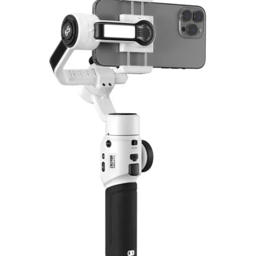 The Zhiyun-Tech white SMOOTH 5S Pro Smartphone Stabilizer Combo includes a magnetic fill light, a carrying bag, a wrist strap, a 1-year Zhiyun Prime membership, and a smartphone gimbal. A strong integrated fill light, improved motors, a new algorithm, and a wider clamp have all been added to the SMOOTH 5S. The SMOOTH 5S will even support some external lens/smartphone combinations, supporting larger smartphones weighing 0.15 to 0.30 kg, measuring 1.01 cm thick and 5.08 to 8.89 cm wide. You can create more extreme, cinematic angles if there is more room between each of the three axes.