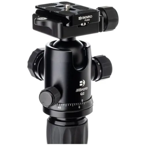 The Q2 Triple Action Arca-type ball head features separate head and pan locks, a 360° pan index, and an integral bubble level. The included quick-release plate has a 1/4″-20 camera screw and rubberised pads for added traction to prevent the camera from moving and protects the finish from marring.