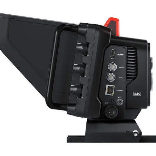 The Blackmagic Studio Camera 4K Pro G2 tucks the benefits of a large studio camera into a single compact design. Its lightweight carbon fiber reinforced polycarbonate body provides innovative technology in a miniaturized design. The camera is designed for live production, so it’s easy to track and frame shots with its large 7″ viewfinder. Control is provided via your switcher or software or by using the touchscreen menus for camera settings and knobs for brightness, contrast, and focus peaking. The included tripod mount with 15mm LWS rod ports and mounting plate speeds your setup.