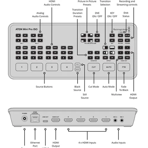 The Blackmagic ATEM Mini Pro ISO is a live production switcher with a new 5 stream recording engine that records all video inputs, allowing the user to edit the live productions later. Users can get a clean feed of all inputs and use multi-cam functionality in edit software for subsequent editing. ATEM Mini Pro ISO also records all audio files, media pool graphics, and a DaVinci Resolve project file, allowing you to open and edit a live production with a single click.