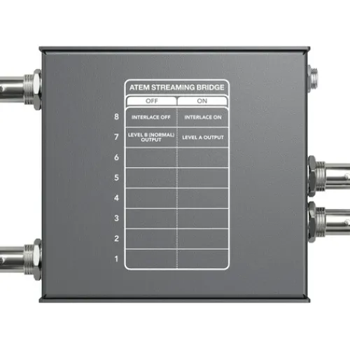 The Blackmagic Design ATEM Streaming Bridge is designed for ATEM Mini Pro Streaming Switchers, enabling you to convert the IP signal from any ATEM Mini Pro unit into SDI and HDMI video. It features two SDI outputs and a single HDMI output, supporting resolutions up to 1080p60. You can connect the Streaming Bridge directly to the streaming output of your ATEM Mini Pro, providing SDI and HDMI output for broadcast environments or direct monitoring. Additionally, by connecting the Streaming Bridge to the same LAN as your ATEM Mini Pro, the devices will automatically detect each other, making it easy to stream across the network.