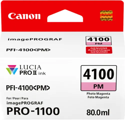 The PFI-4100 Photo Magenta Pigment Ink Tank from Canon is designed for use with the imagePROGRAF PRO-1100 printer, employing the LUCIA PRO II ink system to achieve precise colour reproduction, increased clarity, and enhanced details in darker areas. With a generous capacity of 80mL, this ink tank is ideal for producing high-quality prints.