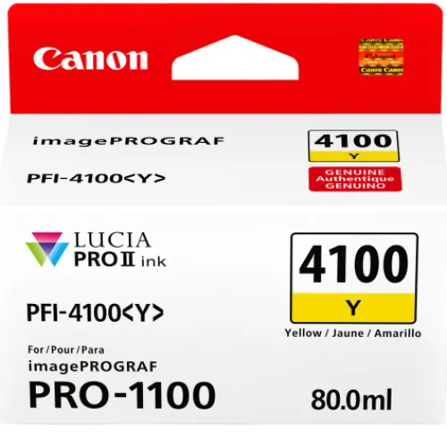 The PFI-4100 Yellow Pigment Ink Tank from Canon is designed for use with the imagePROGRAF PRO-1100 printer, employing the LUCIA PRO II ink system to ensure images feature precise colour accuracy, improved clarity, and enhanced detail in darker areas. With a generous capacity of 80mL, this tank is perfect for achieving stunning print quality.