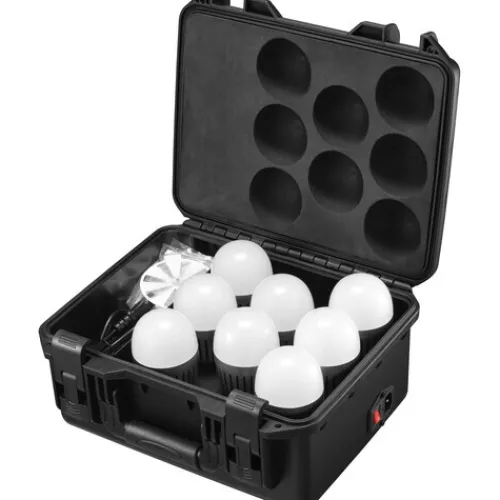 This 8-light kit of the Godox C7R KNOWLED RGBWW Creative Bulb is a versatile and efficient solution for enhancing sets. It includes a charging case with individual sockets to recharge each bulb, along with two USB-C cables, a power cord, and eight round cup bouncer diffusers for added light modification capabilities.
