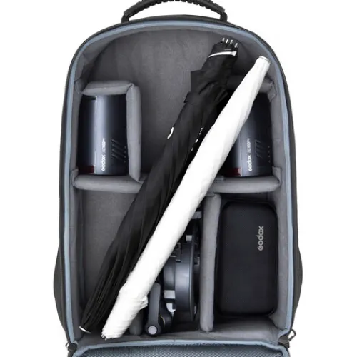 This CB20 Backpack from Godox holds two AD200, AD200Pro, AD300Pro, or AD400Pro strobe units complete with batteries, chargers, wireless remotes, and compact umbrellas for a fully portable lighting setup. Even when fully packed with the lights and accessories, the CB20 still has room to add a camera with lenses and a spacious lined pocket holds a 15″ laptop or tablet.