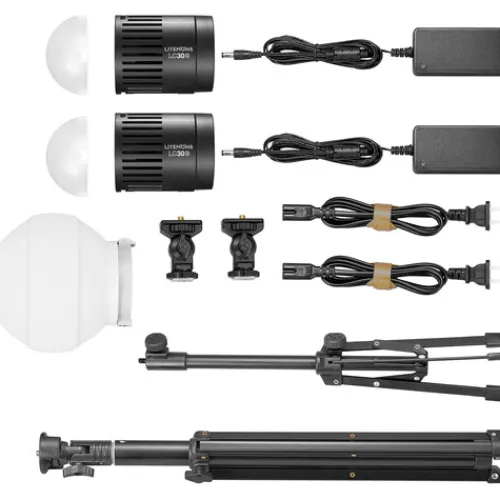 The Godox Litemons LC30D Tabletop LED Two-Light Kit is a lightweight and portable lighting solution designed for content creators, tabletop product photographers, vloggers, and similar users. This versatile and efficient kit includes two LC30D LED lights, providing bright and dimmable illumination for small product photography and tabletop livestreaming. With high CRI and TLCI ratings of 95 and 96, the lights ensure accurate colour renditions and realistic skin tones. The kit also includes two small diffusers, a large diffusion dome, a desktop tripod, and a traditional tripod, allowing you to configure your lighting setup and camera placement for maximum creative effect. Overall, the LC30D Two-Light Kit offers an intuitive and budget-friendly solution for illuminating and enhancing your shooting area.