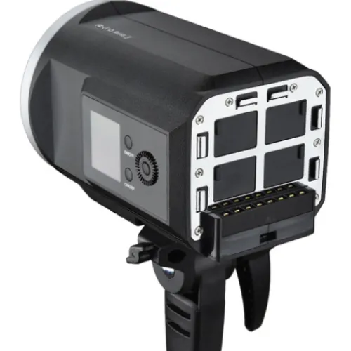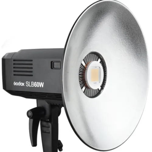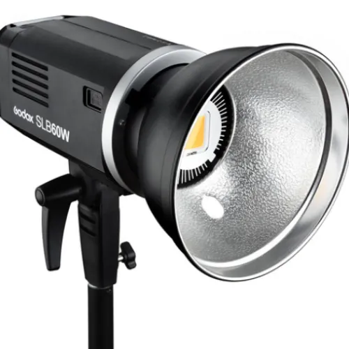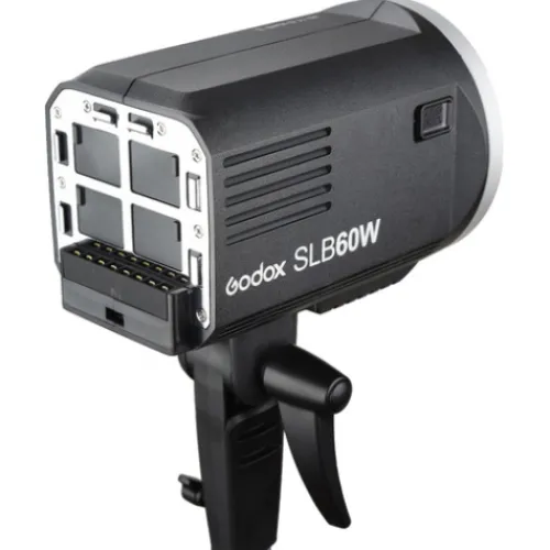 The SLB60W’s lithium-ion battery will give you 60 minutes of runtime on a full charge and you can charge a spare while shooting with a topped-up battery. There’s also an optional AC power source for shooting in the studio or places with available main power. The SLB60W is standing mountable and has a Bowens front accessory mount, making it compatible with accessories from the many manufacturers who use this popular mount.