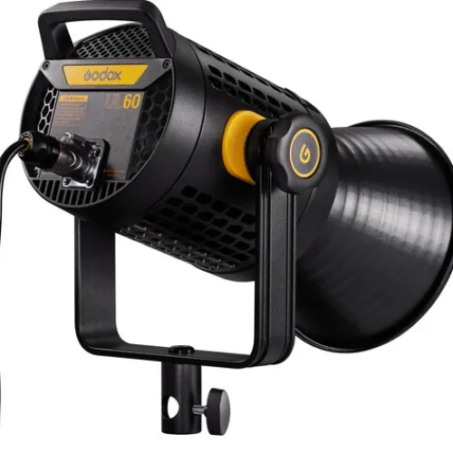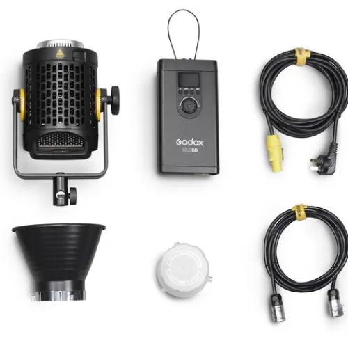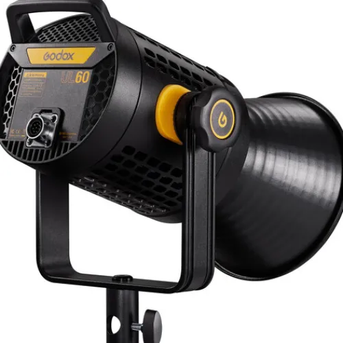 The Godox UL60 Silent LED Video Light is a versatile 60W LED light balanced for daylight use. Tailored for sound-sensitive environments, it boasts a fanless cooling design ensuring 100% silent operation, making it perfect for interviews, online streaming, broadcasting, and cinematography. Delivering natural light and precise colours, the UL60 offers eight preset lighting effects such as flash, storm, TV, and broken bulb effects. It provides multiple control options, including adjustments via the included controller box, compatibility with DMX512, wireless control via the optional RC-A6 remote, or through Bluetooth-enabled devices using the Godox Light app. The light also features a Bowens S-mount for accessory compatibility, and with separately-purchased V-mount batteries, it can be powered anywhere, offering unmatched versatility for various lighting setups.