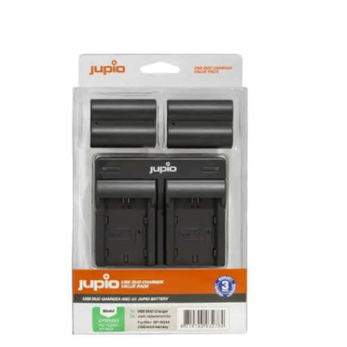 The Jupio Fujifilm NP-W235 Batteries & Dual Charger Kit contains a USB Charger that can simultaneously charge two NP-W235 Fujifilm batteries and features an LED charge status indicator. It has overcharging and overheating protection and can be powered by the mains or separately available USB power banks.