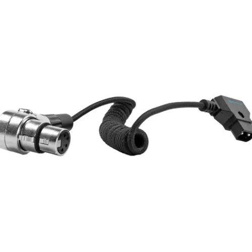 This Coiled D-Tap Male to 4-Pin XLR Female Right-Angle Power Cable allows you to connect a D-Tap power source, such as professional Gold mount or V-mount batteries, to any device that accepts 4-pin XLR female power inputs. It features a D-Tap male connector on one end and a 4-pin XLR female connector on the other. The coiled cable can extend from 20 to 50 inches in length.