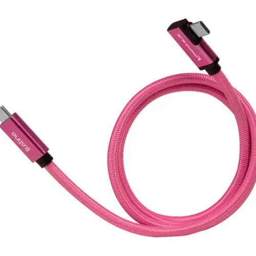 Sync and charge your devices with the 3′ Kondor Blue iJustine Male USB-C 3.2 Gen 2 Right Angle Cable. Teaming up with the tech aficionado herself, the iJustine edition sports a reinforced pink nylon jacket that adds a unique layer of protection and style. With USB 3.2 Gen 2 interface, you get up to 10 Gb/s data transfer speeds as well as 100W power delivery to support resource-demanding devices such as displays, storage arrays, and more. Reinforced metal connectors ensure a strong and reliable connection with one end of the cable offering a right-angled design.