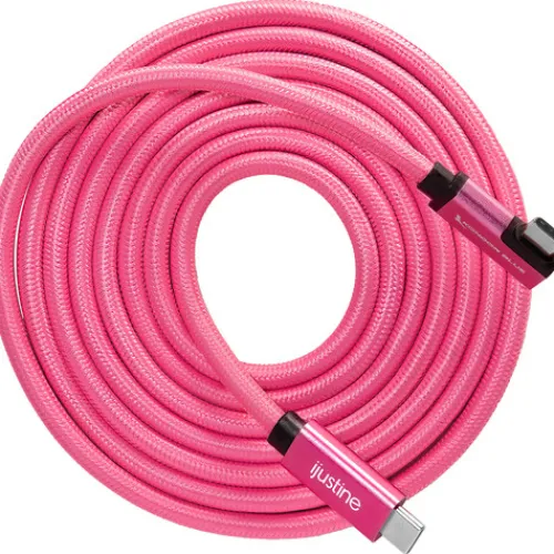 Sync and charge your devices with the 6′ Kondor Blue iJustine Male USB-C 3.2 Gen 2 Right Angle Cable. Teaming up with the tech aficionado herself, the iJustine edition sports a reinforced pink nylon jacket that adds a unique layer of protection and style. With USB 3.2 Gen 2 interface, you get up to 10 Gb/s data transfer speeds as well as 100W power delivery to support resource-demanding devices such as displays, storage arrays, and more. Reinforced metal connectors ensure a strong and reliable connection with one end of the cable offering a right-angled design.