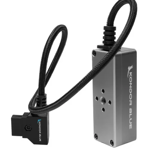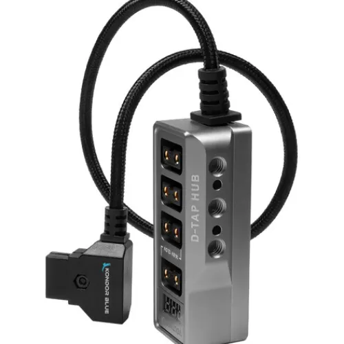 The durable aluminium hub features one regulated 12V female D-Tap port and three 14.8V D-Tap ports. The flexible 40.64 cm braided nylon cable features reinforced cable joints and a male D-Tap connector to plug into a power source such as a professional V-mount or Gold mount battery. There are multiple 1/4″-20 threads on the sides and back of the hub to mount it onto a cage or rig. A voltmeter status LED on the male connector indicates discharge status.
