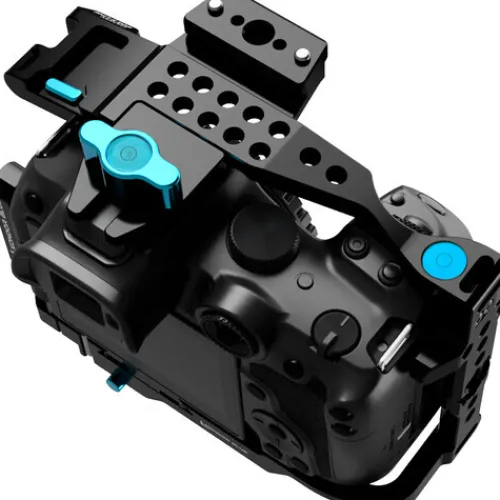The cage remains solidly mounted on the camera to prevent wiggle and allow for large setups