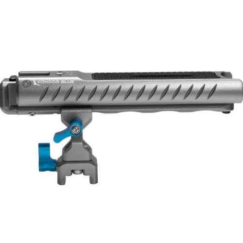 The KONDOR BLUE Pro-Blade SSD Handle also features a cold shoe with a spring-loaded safety stop and 2x 1/4 20 ARRI style mounts. The mounting NATO clamp can also be oriented in parallel or perpendicular modes and is held in place with two captive M4 bolts and anti-twist pins. The NATO clamp stem can also be removed altogether to work with KONDOR BLUE’s NATO Clamp to ARRI Rosette and Quick-Release Rosette Module.