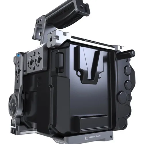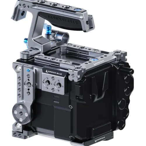 The space grey Camera Cage with Top Handle from Kondor Blue equips your RED V-RAPTOR with multiple mounting plates on all sides, enhancing your accessory compatibility. Its modular design allows the components to be mounted either independently or together, depending on your gear setup needs. The included top handle offers additional mounting options and features an ergonomic rubber grip for comfortable handling.