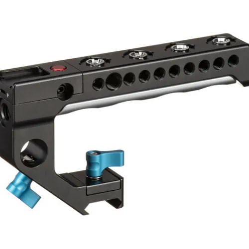 A cold shoe at the top of the cage can accommodate a wireless receiver or shotgun microphone. Two NATO rails can attach other accessories like the included top handle for even more mounting options and a start-stop record button. A built-in Arca-Swiss plate system secures the camera in the cage and offers a quick release configuration.
