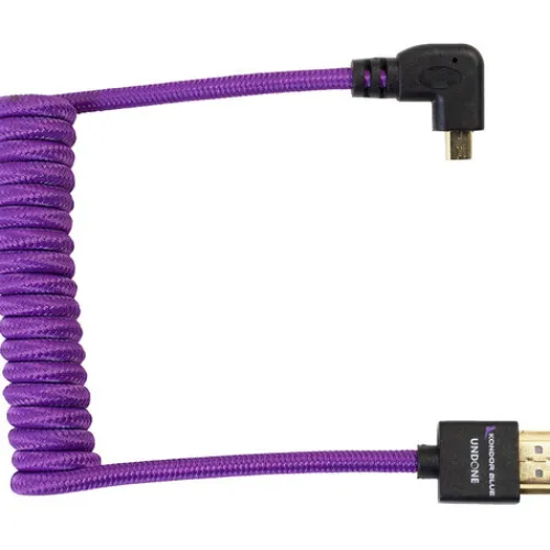 Connect your monitor to your compatible camera neatly with the limited purple edition, 12 to 24″ Kondor Blue Gerald Undone Braided Coiled High-Speed Right-Angle Micro-HDMI to HDMI Cable. This cable supports 3D, HDR, and resolutions up to