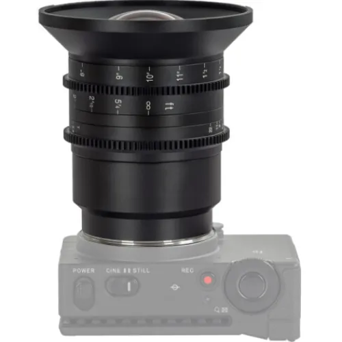 The 12mm cine lens features a maximum aperture of T2.9 with 16 elements in 10 groups. Its 7-blade aperture provides a soft, pleasing bokeh, a shallow depth of field with little to no distortion, and a 7″ close focus distance from the camera sensor (4″ from the lens front). The focus and aperture rings feature industry-standard 0.8-MOD gearing that will accommodate standard cine follow focus motors. The 102mm front diameter can be stepped up to 114mm with the included adapter to fit industry-standard matte boxes to prevent glare and reflection, as well as to add filters. Focus, aperture, and depth of field markings are in feet on the side of the lens to aid focus pullers.
