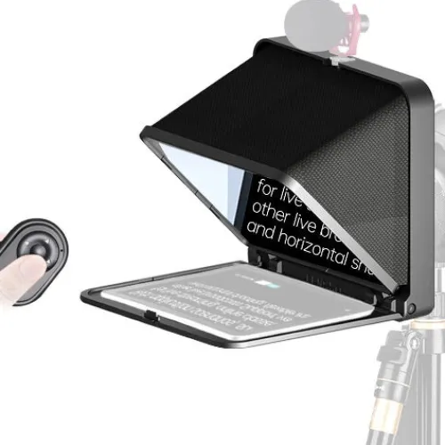 It supports shooting with wide angle lens of 17mm. The teleprompter can be folded in 1 second, the glass can be fixed at a 45 degree angle for you to clearly wathc the lines. Featuring multiple cold shoes, you can attach microphone,tripod and video light on this kit. The size of this teleprompter is 8″, easy to fold and portable to carrying.