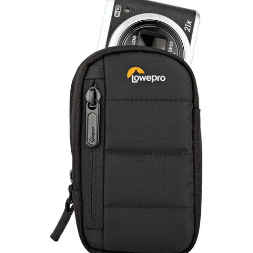 The Lowepro Tahoe CS 20 in black is a small, portable pouch for a point-and-shoot camera. The interior has a padded, non-abrasive polyester liner, and its wide, zippered design makes it simple to access a camera. The exterior is made of weather-resistant nylon and polyester, which further safeguards the contents. A memory card, extra battery, or small personal items can be stored in the front accessory pocket, which zips shut.