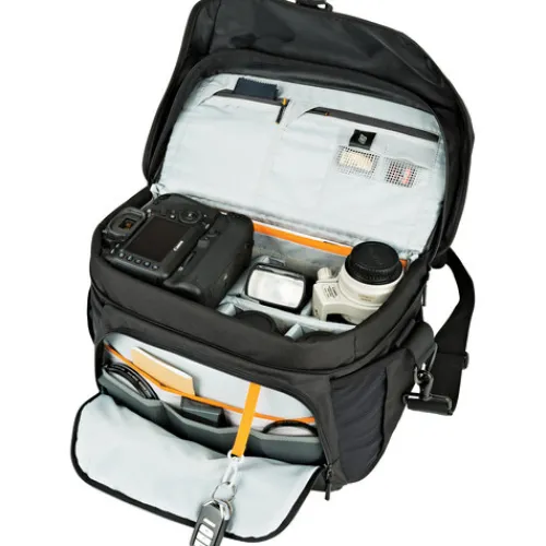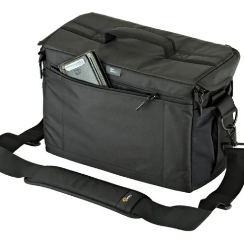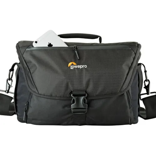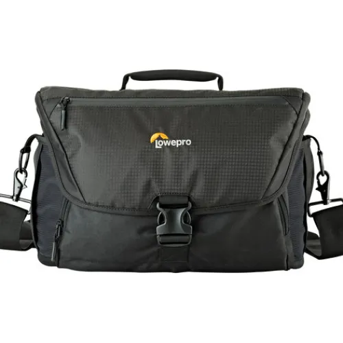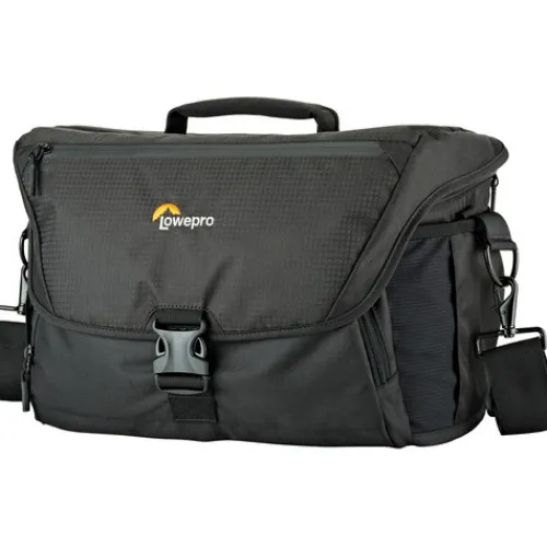 The black Nova 200 AW II Camera Bag from Lowepro is a messenger-style bag made for travelling photographers that can hold a professional DSLR or mirrorless camera along with two to four extra lenses, a flash, and various small accessories. Removable dividers are included in its roomy main compartment, allowing you to arrange the interior space however you see fit for your equipment. The case is closed with a zipper as well as a large flap with a buckle, helping to keep your equipment secure even in bad weather. An all-weather cover is provided as an added measure of security to protect the bag from snow and rain.