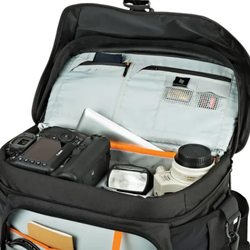 Several pockets located around the exterior of the bag give you convenient access to small items. The front compartment has three interior pockets that are ideal for filters or lens caps, as well as space for a manual or small book. At the front of the lid, another zippered compartment can be used for everyday items such as your phone, wallet, or keys. Exterior mesh pouches with no closure are also available on each side for small accessories. Finally, a zippered slip pocket in the back can hold flat items such as passports or wallets.