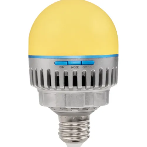 The PavoBulb 10C fits into a standard E27 socket and is powered from the lamp’s AC, but it also has external battery capabilities for locations without available AC. A range of optional accessories allows it to be used anywhere. The Nanlite E27 Magnetic Mount and AC Adapter is an optional accessory with a magnetic mount, providing more freedom for placing a PavoBulb in shots to appear as a normal lightbulb when used in the frame, providing scene-based lighting.