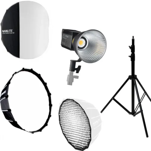 Our Nanlite Start Up Kit comprises a Forza 60B MK II COB light, a Forza Mini Mount Lantern, a Forza FM Mount Softbox, a Nanlite grid tailored for the softbox, and a high-quality 2.88m light stand.