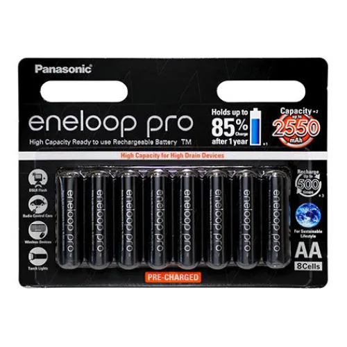 The Panasonic Eneloop Pro AA Battery 8 Pack features a unique in-house developed LSD (low self-discharge) design which maximises its lifespan by retaining up to 65% of its charge after 5 years of storage at 20°C. This means the battery is always ready to go when needed most.