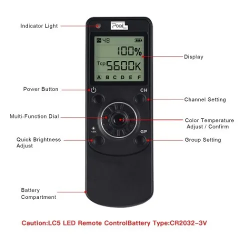 The Pixel LED Light Remote Controller LC5 works in conjunction with selected Pixel LED panels, giving you the full control over your LED lights. It features up to 48 channels in 6 groups settings and HD LCD display allowing you to remotely adjust settings, including brightness, colour temperature and channel/group selection.