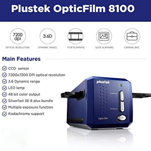 The Plustek OpticFilm 8100 is a dedicated and versatile film scanner with 7200 dpi optical resolution ideal for a wide range of users, including home users, lomographers, small office / workshop users, amateur photographers and photographers. Its light sources give images more precise colour rendering with less power consumption. Two one-touch buttons make scanning easier and more efficient for sharing on websites such as Flickr, Facebook, Picasa, etc. The Plustek OpticFilm 8100 and new SilverFast SE Plus 8 software make a perfect combination.