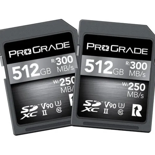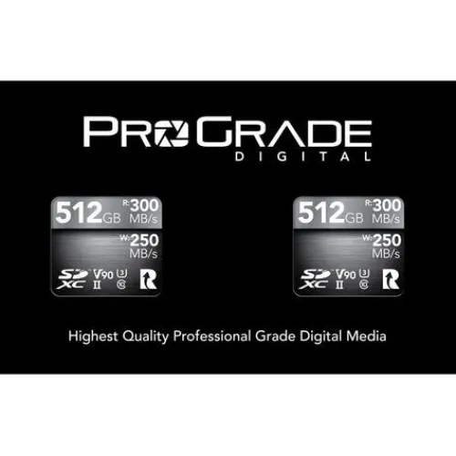 The ProGrade Digital 512GB SDXC UHS-II V90 Cobalt Memory Card (2 Pack) is built for professional photographers and videographers needing fast, dependable storage for demanding projects. With UHS-II, V90, U3, and Class 10 ratings, it supports high-resolution formats including 6K, 5K, 4K, Full HD, and 3D video, as well as high bit rate MPEG-4 files. Offering maximum read speeds of 300 MB/s and write speeds up to 250 MB/s, it’s also ideal for capturing raw images and high-speed burst shooting.