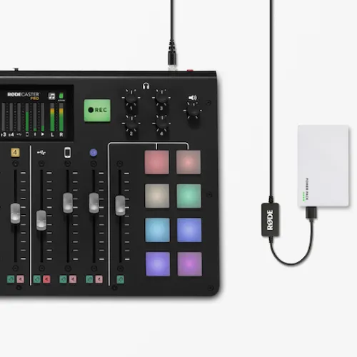 The Rode DC-USB1 is a power cable that connects the RØDECaster Pro to USB. This allows power to be drawn from a high power USB port (2.4A minimum). It features a locking connector for an extra layer of security.