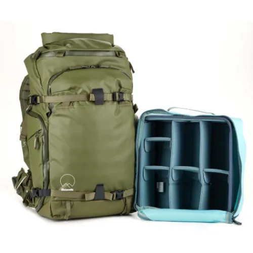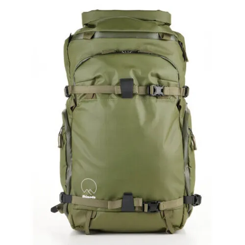 This army green Action X30 V2 Starter Kit from Shimoda Designs includes an Action X30 backpack, a medium mirrorless core unit, a helmet holder, and a rain cover. The pack offers photographers a compact and durable carry solution that allows fast access to gear. The internal core unit is a divider insert that can accommodate most non-gripped, 4.7″ mirrorless cameras. Two padded sleeves hold and protect laptops or tablets up to 14″. The roll top access allows you to expand or compress the volume depending on your needs. There are multiple attachment straps including TPU compression straps for increased durability when attaching bulky items such as skis. The removable helmet holder secures a bike or ski helmet to the exterior of your pack.