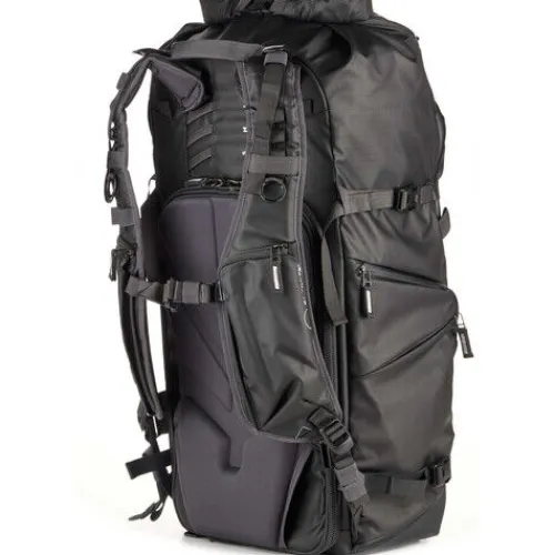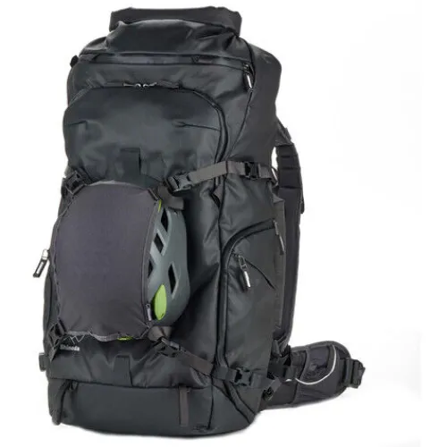 The black Action X50 V2 Backpack from Shimoda Designs offers a 50L capacity, delivering a compact, durable carry solution for photographers needing fast access to their gear. Two padded sleeves provide protection for laptops or tablets up to 16″. The roll-top access allows you to adjust the pack’s volume based on your needs. It features multiple attachment straps, including TPU compression straps, designed to enhance durability when securing bulky items like skis. The removable helmet holder allows you to attach a bike or ski helmet to the exterior of your pack.