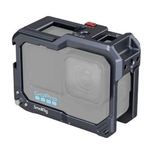 The SmallRig Cage 3084C is expertly crafted for GoPro Hero 13, 12, 11, 10, and 9 Black cameras, offering durable protection and enhanced versatility. Its form-fitting design maintains full access to the screen, buttons, and USB-C port, ensuring an unhindered user experience. The cage locks securely with a press-and-release button system and includes two cold shoe mounts on the top and right side, ideal for attaching accessories like a microphone or LED video light without blocking the GPS signal. A GoPro mount and a 1/4″-20 threaded hole on the bottom support a range of original GoPro accessories, including the GoPro ND Filter Kit, Ultra Wide Lens Mod, Macro Lens Mod, and Contacto Power Door, as well as Tripod 3991, Magic Arms 3873 / 3874 / 3959, and other compatible mounts. The innovative side plate allows quick battery access and offers magnetic EVA mounting for easy removal and extra protection without needing to disassemble the original side plate. Perfectly designed to enhance your GoPro setup, this cage ensures your camera is ready for any adventure.