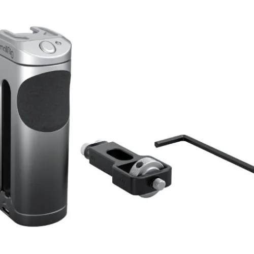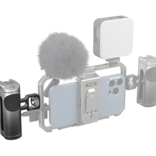 The SmallRig Side Handle with Wireless Control for Cellphone 3838 features a built-in rechargeable wireless remote control module, allowing you to start or stop recording on most Android and Apple smartphones, enhancing shooting efficiency. A cold shoe mount on top enables attachment of a microphone or LED light for a more professional setup. The handle is versatile, adjustable for both left and right-hand use, and can be repositioned vertically for better grip and balance. Crafted from durable aluminium alloy with gradient anodising, it combines strength with a sleek look. A bottom hole is included for attaching a hand strap to prevent accidental drops during shooting.