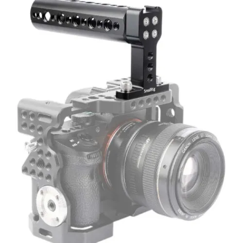 The SmallRig Top Handle (1/4″-20 Screws) 1638C is designed to enhance low-angle shooting and reduce arm strain. Its ergonomic design offers a comfortable grip, and it comes equipped with various accessory mounts. These include a front cold shoe mount for a microphone, LED light, or Monitor Mount 2905; an ARRI 3/8″-16 locating hole at the rear for Monitor Mount 2903; and 1/4″-20 & 3/8″-16 threaded holes on the top and sides for attaching the Magic Arm 2070 to mount monitors. The handle is also compatible with Remote Control 2924 for camera recording. It can be installed via standard threaded holes, providing flexibility and ease of use.