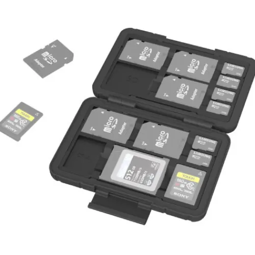 The SmallRig Memory Card Case 3192 offers secure storage and protection for your memory cards. With an ergonomic, anti-slip texture, it accommodates 6 SD cards, 6 Micro SD cards, 2 CFexpress Type A cards, and 1 CFexpress Type B (or XQD) card. It features an easy-to-operate on/off fastener, sealable silicone linings to protect against splashes and dust, and cardholders with printed labels for easy identification. The anti-shock card trays ensure your cards are safely secured. Tested to withstand a 2m drop, this case provides reliable protection against accidental falls.