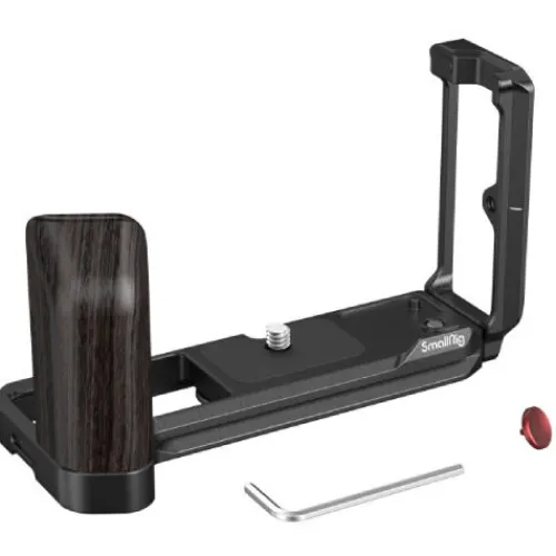 The SmallRig L-Bracket for Fujifilm X-T5 4137 is designed to facilitate a smooth switch between horizontal and vertical shooting while enhancing the grip experience. It secures the camera with a 1/4″-20 screw and a locating pin at the bottom, preventing twisting, with rubber pads to protect the camera from scratches. Full access to all buttons, card slots, battery compartment, and the flip screen is maintained. Featuring a built-in blackwood grip, the bracket provides a comfortable and secure hold. The baseplate includes an Arca-Swiss quick-release plate compatible with Arca-type tripods and DJI RS 2 / RSC 2 / RS 3 / RS 3 Pro gimbals. It also includes 1/4″-20 and 3/8″-16 threaded holes to support Manfrotto-type plates like 1280 or Side Handle 2093 for vertical handheld shots. For added security, there is a strap slot and a QD port for attaching Hand Straps (ID 3848 & 2456) or a quick-release QD shoulder buckle. The side plate features 1/4″-20 threaded holes for accessories like the Cold Shoe Mount BUC2736 (for microphones), and it can stretch to allow cables through. Additional features include a magnetic slotted screwdriver for easy assembly and disassembly, along with a complimentary shutter button for improved touch control.
