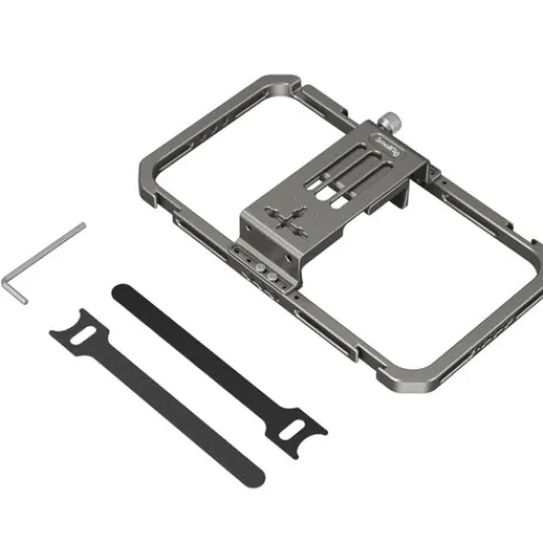 The Universal Mobile Phone Cage from SmallRig is designed to fit most smartphones between 2.2 and 3.5″ wide, with or without an outer case. It secures your phone with a screw that tightens for extra stability, and features four cold shoe mounts plus multiple 1/4″-20 threaded holes for attaching a tripod, top handle, and side handgrip. The 1/4″-20 threaded holes in front can be used to attach a power bank holder for a sustainable charging solution. This cage is suitable for both horizontal and vertical shooting, with integrated rubber pads to absorb shocks and protect your phone from scratches. Two attached cable ties are also included for organising cords and cables while shooting.
